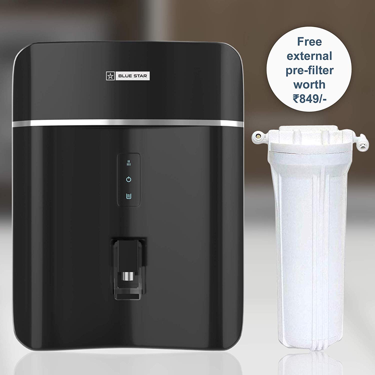 • Multi-stage purification; Auto Start: Yes; Overflow Protection: Yes; Filter Type: External Pre-filter, Pre-carbon Filter, Sediment Filter, RO Membrane, UF Membrane, Post Carbon Filter with Immuno Boost Technology, UV Lamp; Indicators: Purification On, Power On, Tank Full